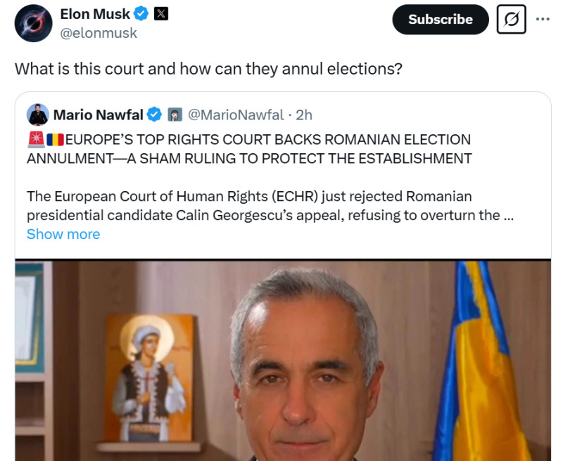 Miliardarul Elon Musk, care în ultimele luni se implică în politica europeană, inclusiv în cea din România, a reacționat pe platforma sa X, după ce CEDO a respins contestația candidatului prorus Călin Georgescu privind anularea alegerilor prezidențiale din 2024. „Ce este această instanță și cum poate anula alegerile?”, a scris Musk, deși CEDO nu a făcut decât să declare inadmisibilă plângerea lui Georgescu, fără să intervină în procesul electoral.