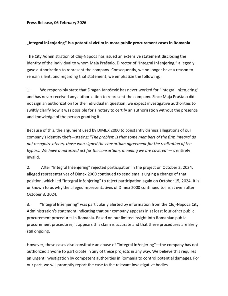 Conducerea Integral Inženjering susține că nu a semnat nicio procură și niciun acord de asociere. Directoarea companiei, Maja Praštalo, afirmă că semnătura sa ar fi fost utilizată fără drept și că documentele depuse în cadrul licitației ar conține informații parțial reale și parțial modificate.