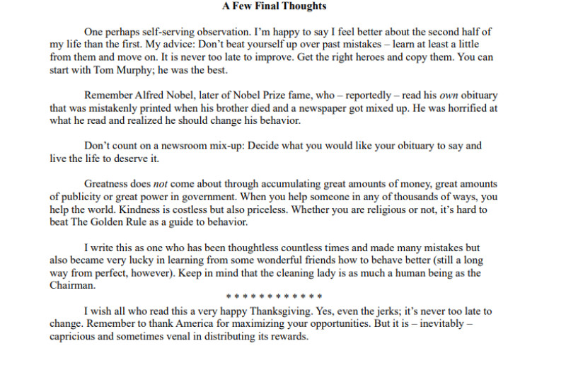 În scrisoare, Buffett, în vârstă de 95 de ani, scrie că „va merge pe tăcute”, renunțând la rolul său public, dar își va continua tradiția mesajului anual de Ziua Recunoștinței către acționari. El își exprimă recunoștința pentru viața trăită în Omaha și povestește cum norocul, oamenii apropiați și mentorii i-au influențat destinul.