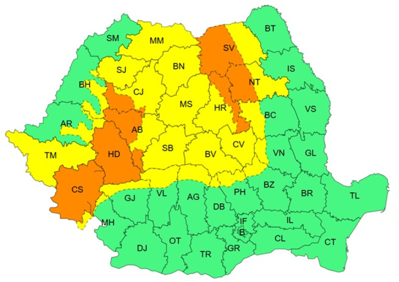 Sunt vizate de această atenționare cea mai mare parte a Transilvaniei și local centrul Moldovei. În zonele menționate vor fi perioade cu instabilitate atmosferică ce se va manifesta prin averse torențiale, descărcări electrice, intensificări ale vântului (rafale de 50...55 km/h) și izolat grindină de mici dimensiuni (1 – 2 cm).