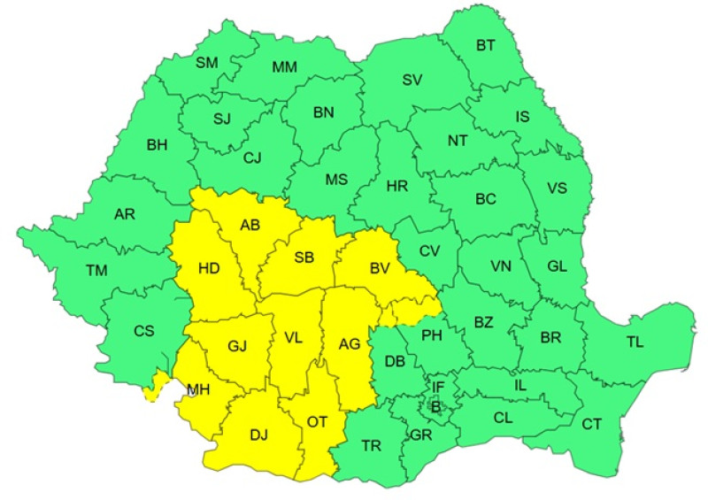 Începând de luni de la ora 12 și până seara la 23 va fi în vigoare un cod galben de instabilitate atmosferică în Oltenia, în sudul Transilvaniei, precum și în nord-vestul Munteniei și în Carpații Meridionali.
