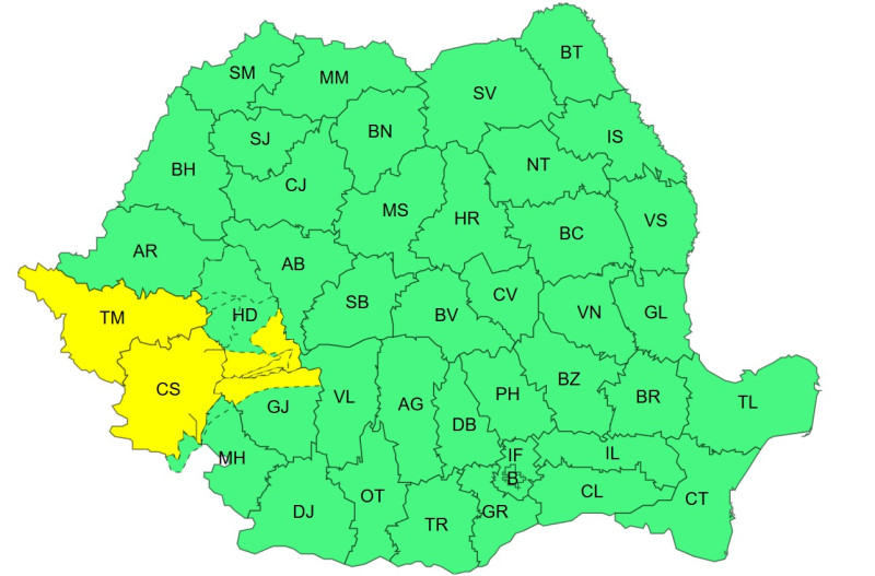 De asemenea, a fost emisă o atenţionare Cod galben privind intensificări ale vântului, valabilă de miercuri, de la ora 8.00, până joi, la ora 20.00, în judeţele Timiş, Caraş-Severin şi parţial în Hunedoara şi Gorj.