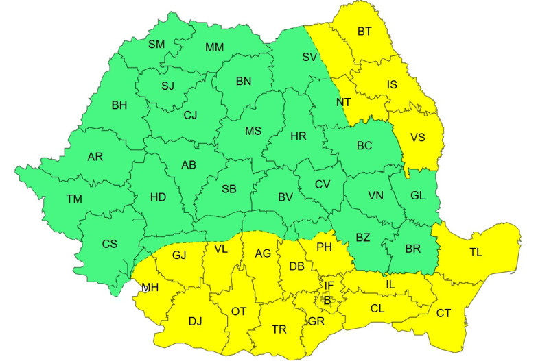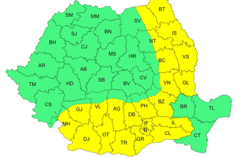Totodată, meteorologii au emis o atenţionare Cod galben de temperaturi deosebit de scăzute, valabilă marţi, între orele 10.00 şi 20.00, în judeţele Botoşani, Iaşi, Vaslui, Tulcea, Constanţa, Ialomiţa, Călăraşi, Ilfov, Giurgiu, Teleorman, Olt, Dolj, în municipiul Bucureşti şi în cea mai mare parte a judeţelor Mehedinţi, Gorj, Vâlcea, Argeş, Dâmboviţa şi în jumătatea estică a judeţelor Neamţ şi Suceava.