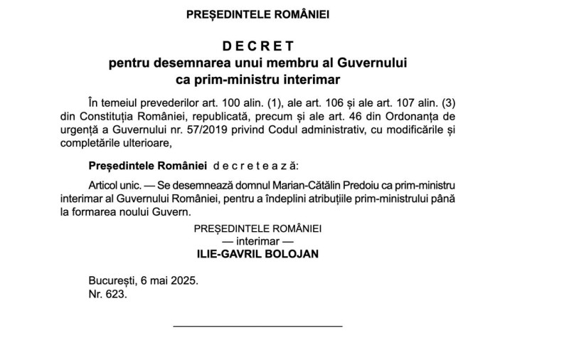 Știrea inițială. Preşedintele interimar Ilie Bolojan a semnat marţi dimineaţa decretul pentru desemnarea lui Cătălin Predoiu ca prim-ministru interimar, pentru a îndeplini atribuţiile până la formarea noului Guvern, a informat Administraţia Prezidenţială.
