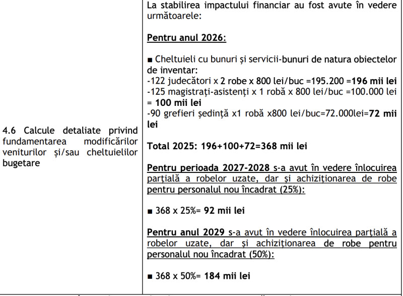 „Pentru perioada 2027-2028 s-a avut în vedere înlocuirea parţială a robelor uzate, dar şi achiziţionarea de robe pentru personalul nou încadrat (25%):