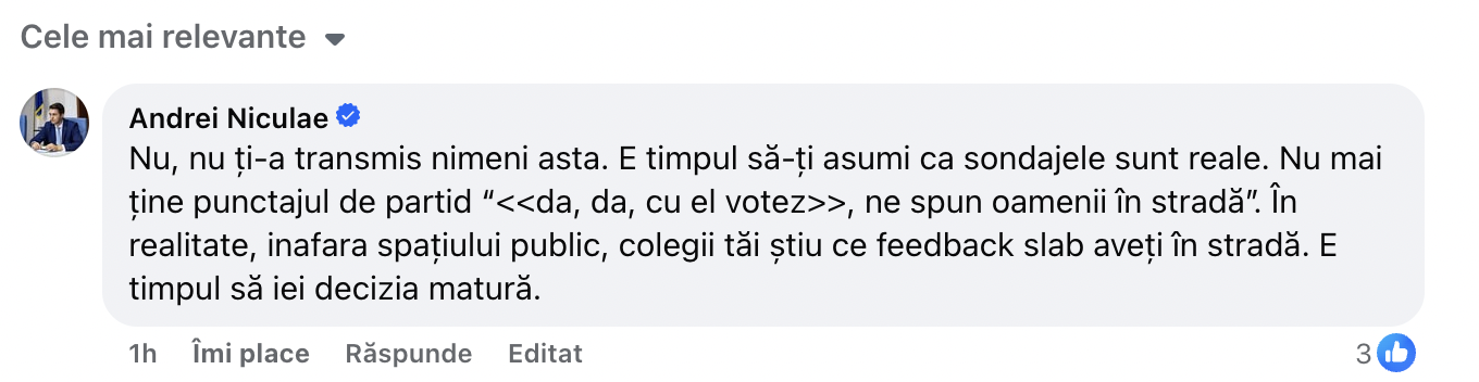 Singura reacție din partea PNL a fost din partea lui Andrei Niculae, care se află în conducerea Autorității pentru Digitalizarea României și vine din rândurile tinerilor liberali.