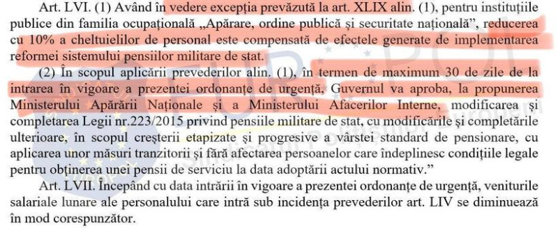 Astfel, potrivit Ordonanţei, ar creşte vârsta de pensionare pentru militari, în sistemul de învăţământ va fi redus sporul pentru doctorat, iar în sistemul sanitar, între altele, va fi introdus un nou sistem de clasificare a spitalelor şi un sistem de salarizare după performanţă.