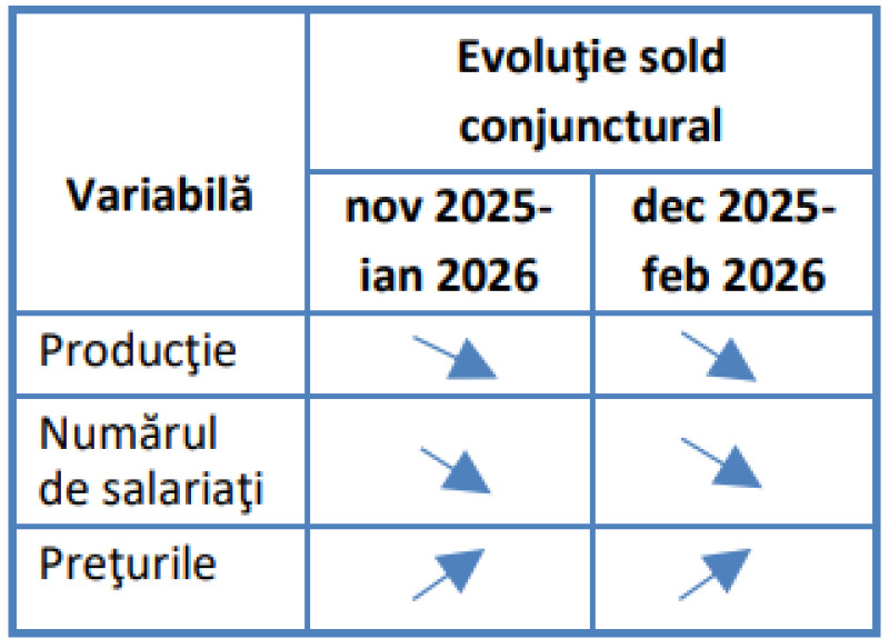 Managerii estimează o scădere semnificativă a volumului producției, cu un sold conjunctural de -24,5%, ceea ce arată o perspectivă clar pesimistă pentru primele luni din 2026.