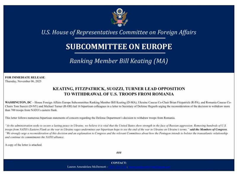 Reacția negativă este formalizată într-o scrisoare adresată secretarului apărării Pete Hegseth, emisă joi și condusă de Bill Keating (D-MA), membru al Subcomitetului pentru afaceri externe al Camerei Reprezentanților, Brian Fitzpatrick (R-PA), copreședinte al Caucusului Ucrainei, și Tom Suozzi (D-NY) și Michael Turner (R-OH), copreședinți ai Caucusului României.