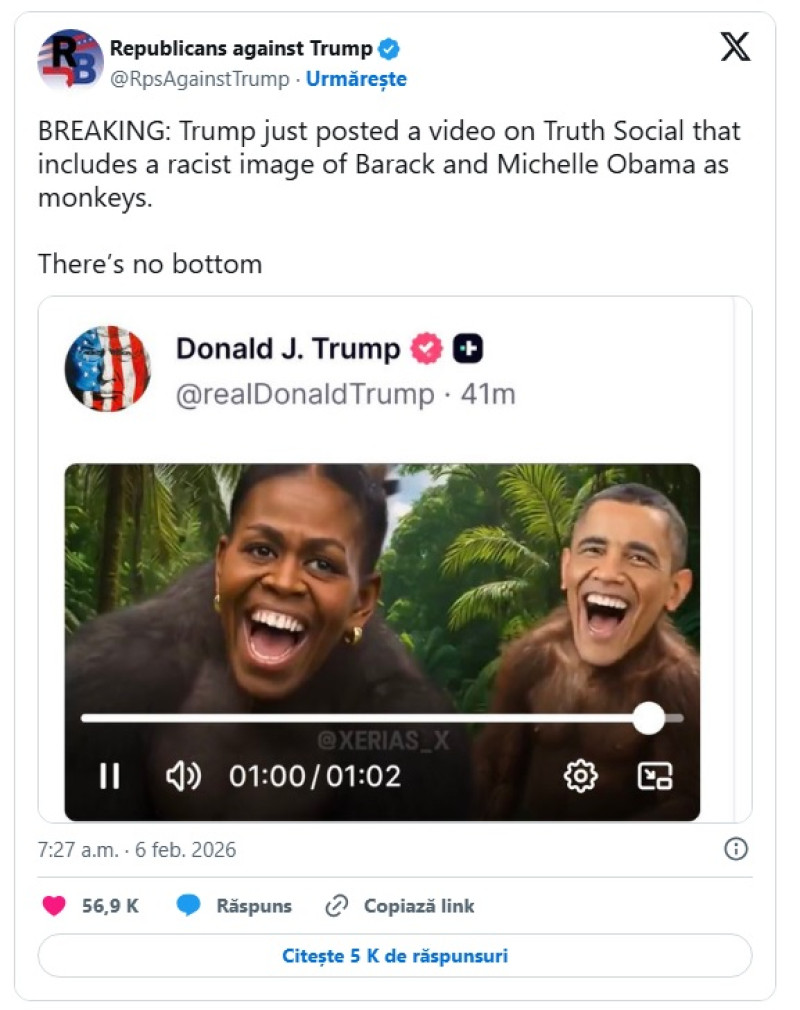 Președintele SUA, Donald Trump, a eliminat un videoclip de pe rețelele sociale care conținea imagini rasiste în care Barack și Michelle Obama erau reprezentați ca maimuțe, scrie BBC.