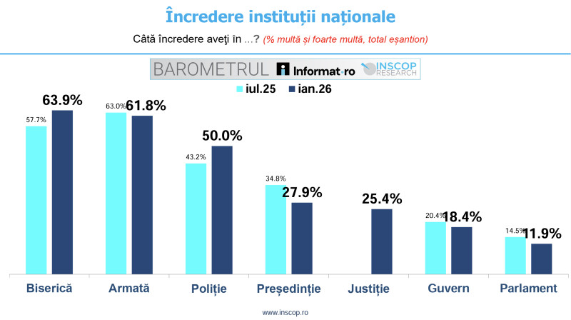 Biserica şi Armata rămân instituţiile în care românii au cea mai multă încredere, relevă Barometrul Informat.ro – INSCOP Research, ediţia a VII-a. Biserica şi Poliţia sunt instituţiile în care încrederea a crescut comparativ cu iulie 2025, toate celelalte instituţii incluse în sondaj - Armata (care se menţine totuşi pe locul al doilea în topul încrederii), Preşedinţie, Guvern, Parlament - înregistrând scăderi. Preşedinţia este pe locul al patrulea, urmată de Justiţie, care a fost inclusă în barometrul din ianuarie 2026, în timp ce Parlamentul este pe ultima poziţie, cu o cotă de încredere de 11,9%.