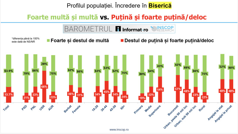 Au încredere în Biserică mai ales: votanţii PSD şi AUR, persoanele de peste 60 de ani, cei cu educaţie primară, locuitorii din mediul rural.