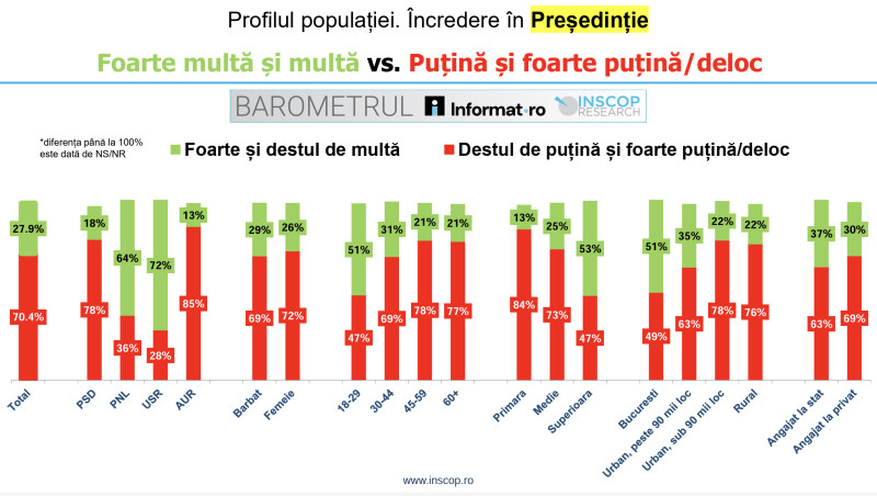 Votanţii PNL şi USR, tinerii sub 30 de ani, persoanele cu educaţie superioară, locuitorii din Bucureşti şi din urbanul mare, angajaţii la stat sunt categoriile care au cea mai multă încredere în Preşedinţie.