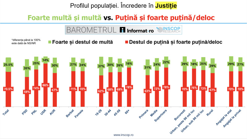 Votanţii PSD şi AUR, persoanele între 18 şi 44 de ani, cei cu educaţie primară au mai multă încredere în Justiţie decât restul populaţiei.