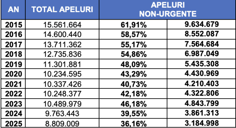 Potrivit sursei citate, evoluția din ultimii 10 ani arată că în 2025 s-a înregistrat un număr de trei ori mai mic al apelurilor non-urgente față de 2015. STS consideră că acesta este rezultatul „mai multor măsuri precum campaniile de conștientizare, dezvoltările continue în domeniu, activități tehnice cu furnizorii de servicii de comunicații electronice, producătorii de terminale telefonice și echipamente de rețea, activități de ordin juridic și operațional cu autoritățile de reglementare și structurile Ministerului Afacerilor Interne sau demersuri împreună cu agențiile specializate de intervenție, dar mai ales este rezultatul activității cetățenilor care au ales să utilizeze responsabil numărul 112”.